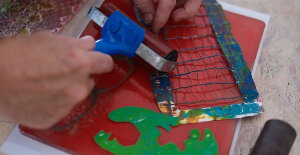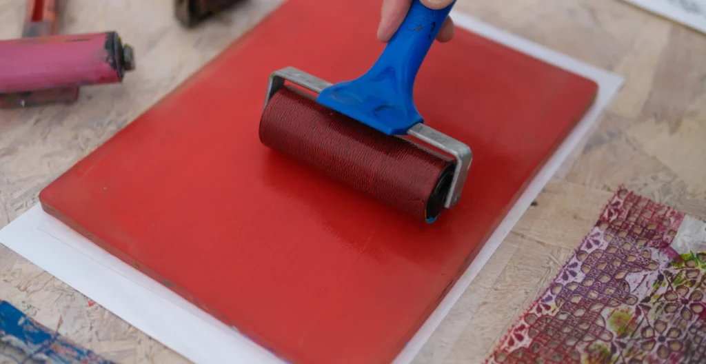 The gelli plate is coated with paint using a roller, you then lay various materials on it and use your hands to lightly rub the surface of the paper, thereby transferring the textures to the paper.