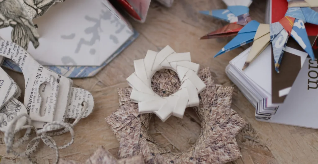 Cet atelier s’inspire de l’art noble et un peu intimidant de l’origami japonais, mais la ressemblance s’arrête là ! Le but n’est pas de réaliser le pliage parfait, sans faute, mais de s’amuser en utilisant des papiers facilement disponibles pour créer des objets en trois dimensions. Je vous mets au défi de ne pas vous amuser !